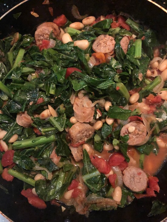 Strain the beans and diced tomatoes and add to the pan with the sliced sausage. Turn down the heat, cover, and simmer for 5-10 minutes. (I’m a fan of crunchy greens but if you like things soft you may need to simmer longer. Be sure to taste as you cook- it’s the only real way to see if things are done!)
